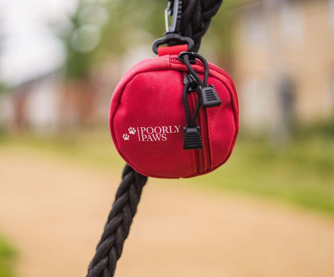 A dog first aid kit that can be easily carried in a pocket, strapped to a lead, collar, or belt containing the vital elements of a first aid kit for dogs.